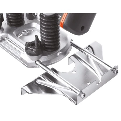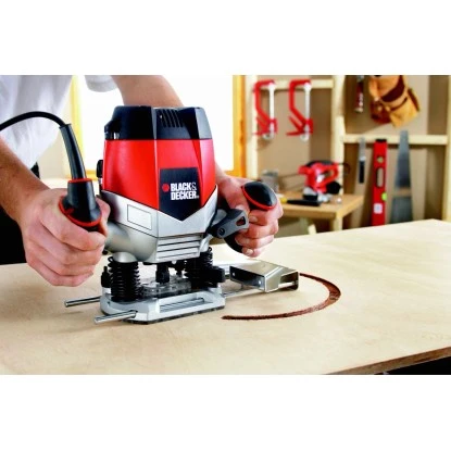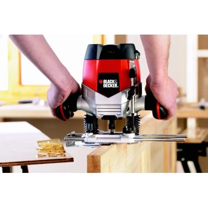Die Black+Decker Oberfräse KW900E verfügt über eine umfangreiche Ausstattung und sorgt mit ihrem 1.200 W Motor für eine überlegene Leistung und eine längere Lebensdauer. Sie ist das ideale Werkzeug, wenn es ums Fräsen präziser Fugen, um Schnitz- und Gravurarbeiten oder um das Ausschneiden von Ellipsen und Kreisen geht. Dabei lassen sich die Geschwindigkeiten für die diversen Arbeiten variabel anpassen. Dank der Spindelarretierung sind Fräserwechsel problemlos, schnell und einfach durchzuführen. Der große Zusatzhandgriff dient der verbesserten Kontrolle ebenso wie die Sicherheitseinschaltsperre für mehr Sicherheit.