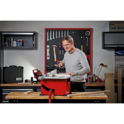 Mühelos arbeitet sich das Sägeblatt mit den Hartmetallsägezähnen durch das Material. Zudem sorgt ein Parallel- und Winkelanschlag für präzise Schnitte. Für das sichere Arbeiten sorgt ein Schiebestock, zum Schutz des Motors ist ein Überlastschutz integriert. Die Kunststofffüße am Metallgehäuse bieten einen sicheren und rutschfesten Stand.