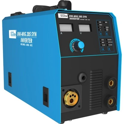 Das Güde Universalschweißgerät Uni-Mig 205 SYN ist ein leistungsstarkes Inverter-Schweißgerät, das zu den Universalgeräten der Güde-Produktlinie gehört. Mit Diem Gerät sind praktisch alle 4 Schweißverfahren möglich: MIG-MAG, MMA (Elektrodenschweißen), Flux (Fülldrahtschweißen) und optional auch WIG-Schweißen.