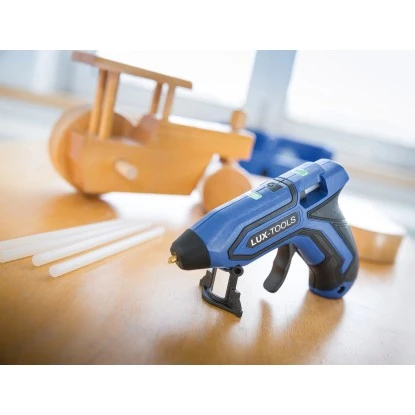 Die kompakte LUX-TOOLS Heißklebepistole AHKP-3,6/1,7 eignet sich für vielseitige Bastel- und Heimwerkerarbeiten. Sie ist universell einsetzbar für Pappe, Holz, Kunststoff, Keramik oder Textilen. Dank Akku-Betrieb ermöglicht Sie Ihnen den flexiblen Einsatz, unabhängig von einer Steckdose. Somit entfällt das lästige Stromkabel, das bei Bastelarbeiten häufig stört. Integriert ist ein 3,6 V Lithium-Ionen-Akku, der 1,5 Ah leistet. Mit einer Aufheizzeit von nur 90 Sekunden ist die Klebepistole schnell einsatzbereit. Dazu leuchtet die LED-Anzeige auf der Oberseite bei Betriebsbereitschaft grün auf.