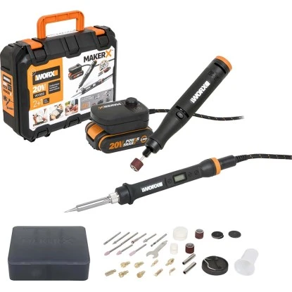 Das Worx MakerX Doppel-Set besteht aus zwei Mini-Tools für kreatives Arbeiten wie Basteln, Modedesign, Reparaturen, der Restaurierung und Holzbearbeitung. Das Akku-Multifunktionswerkzeug ist zum Schleifen, Bohren, Polieren und Gravieren geeignet, während der Lötkolben für Brandmalerei und beim Löten zum Einsatz kommt.